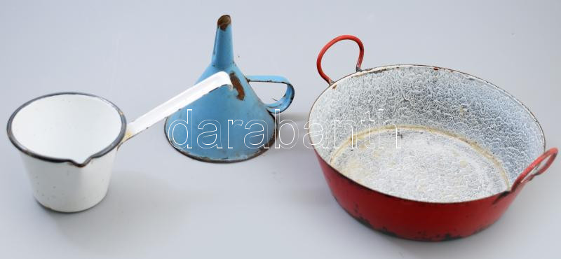 3 darab antik zománcozott konyhai tárgy, kopással. https://www.darabanth.com/hu/479-Gyorsarveres/479.0/Mutargy-papirregiseg-egyeb/Bolhapiac~500017/3-darab-antik-zomancozott-konyhai-targy-kopassal~II3268026