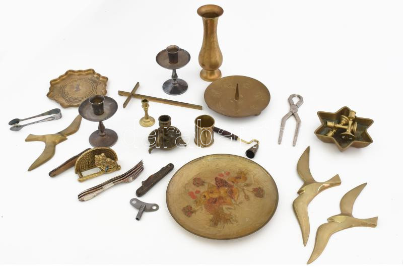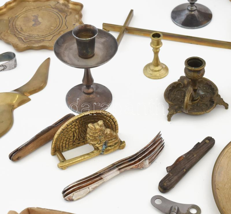 Leírás: 30 darabos zömmel bronz bolha tétel, közte sétáló gyertyatartó, zománcozott dísztál, antik bicskák, ezüstözött süteményes villa szett, cukorfogó, stb.