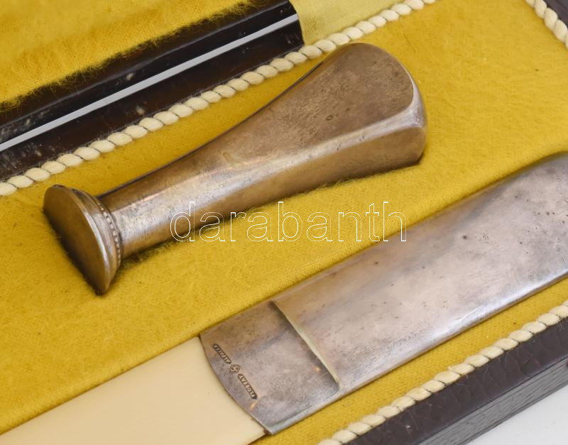 Leírás: Saturnus íróasztali szett: ezüst (Ag) töltőceruza, alpakka pecsételő, alpakka nyelű levélbontó, díszdobozban, jelzett.