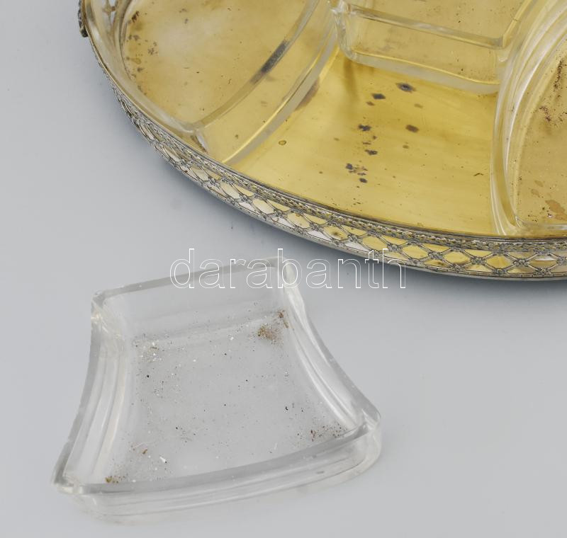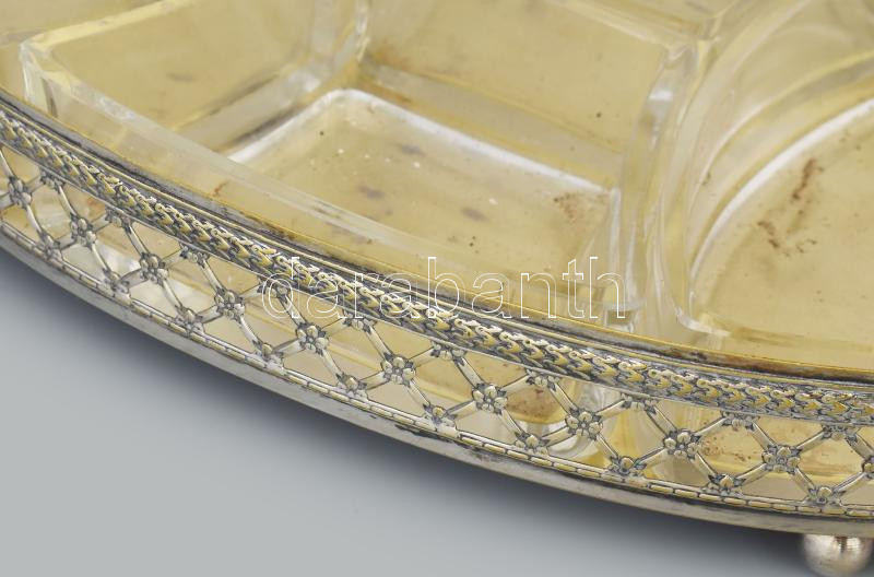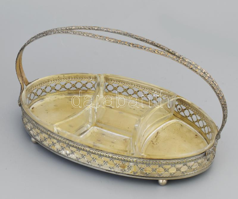 Leírás: Szecessziós ezüstözött kosár kínáló, eredeti üveg betétekkel, 30x18 cm