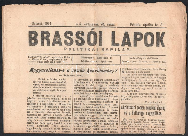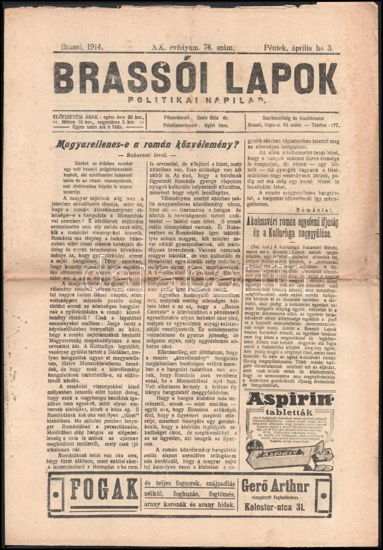 Leírás: 1914 A Brassói lapok c. folyóirat XX. évf. 76. szám benne Magyarellenes-e a román közvélemény c. cikkel