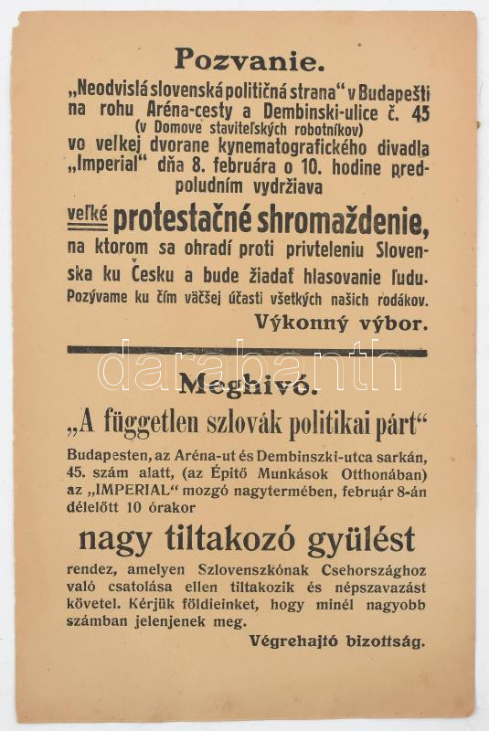 1918 Meghívó a független szlovák politikai párt Szlovákiának Csehországhoz való csatolása ellen tiltakozó gyűlésére (a spanyolnátha miatt elmaradt), kisméretű hirdetmény magyar és szlovák nyelven, 21,5×14 cm / 1918 Summon to a protest against the annexation of Slovakia to the Czech Republic, organized by the independent slovak party (the protest was cancelled due to the Spanish flu), in Hungarian and Slovak, 21,5×14 cm