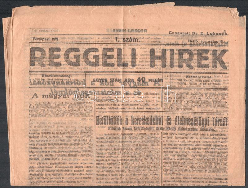 1919 augusztus 18. A Reggeli Hírek c. újság 1. száma román cenzúrával https://www.darabanth.com/hu/479-Gyorsarveres/479.0/Mutargy-papirregiseg-egyeb/Nyomtatvanyok~1000013/1919-augusztus-18-A-Reggeli-Hirek-c-ujsag-1-szama-roman-cenzuraval~II3246587