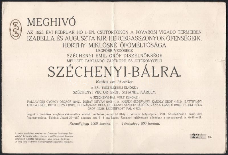 1923 Bp., Meghívó a Széchenyi-bálra https://www.darabanth.com/hu/479-Gyorsarveres/479.0/Mutargy-papirregiseg-egyeb/Nyomtatvanyok~1000013/1923-Bp-Meghivo-a-Szechenyi-balra~II3270930