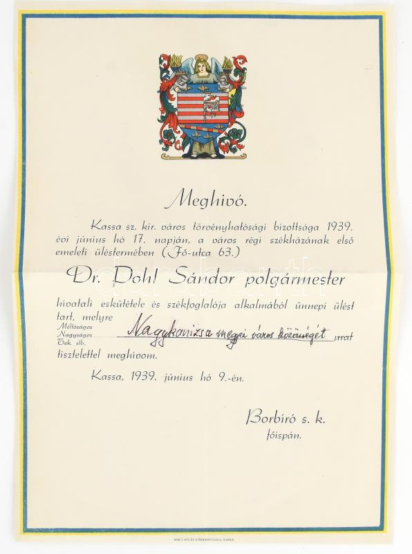 1939 Kassa címeres meghívó dr. Pohl Sándor polgármester eskütételére https://www.darabanth.com/hu/479-Gyorsarveres/479.0/Mutargy-papirregiseg-egyeb/Nyomtatvanyok~1000013/1939-Kassa-cimeres-meghivo-dr-Pohl-Sandor-polgarmester-eskutetelere~II3272144