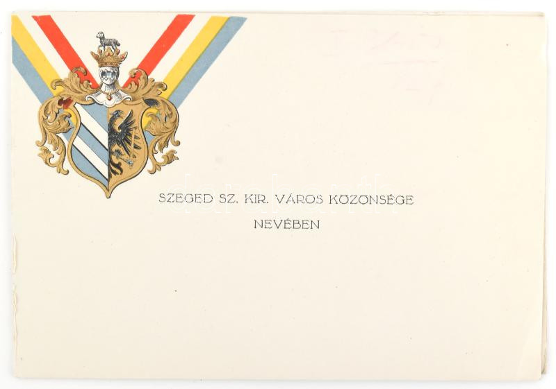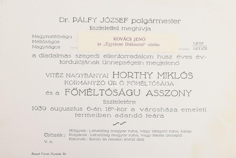 Leírás: 1939 Szeged címeres meghívó Horthy Miklós és felesége részvételével tartott fogadásra.