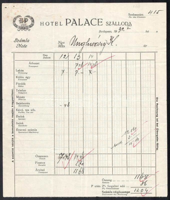 Leírás: 1932 Bp., Hotel Palace Szálloda fejléces számlája