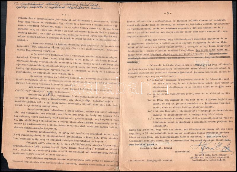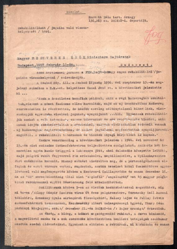 Leírás: 1957 Horváth Béla dachaui deportált rehabilitációs kérelme