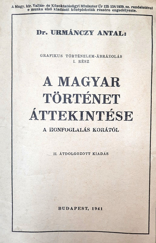 [Plakát] A magyar történet áttekintése a honfoglalás idejétől. Urmánczy Antal újságíró színes infografikája. (Kartográfiai Vállalat reprint 1991.) Budapest, 1941. Kartográfiai Vállalat ny. Színes nyomat, mérete: 640x780 mm egy 675x860 mm lapon. Urmánczy Antal (1868-1940) politikus, újságíró, a függetlenségi politika, később az irredenta mozgalom jelentős személyisége. Pedagógiai segédeszközének első kiadása 1939-ben jelent meg, hasonmás kiadásunk az átdolgozott, második kiadásból való. Színes infografikánk a honfoglalástól a délvidéki bevonulásig (1941) és a szovjet hadüzenetig (1941) vázolja Magyarország történetének számos aspektusát. A diplomáciai, hadtörténeti, belpolitikai, jog- és gazdaságtörténeti részleteket olykor kultúrtörténeti részletek is gazdagítják. Az ország idővonala elsősorban az uralkodók szerint oszlik kisebb részekre, az ország három részre szakadása idején a királyi Magyarország és az Erdélyi Fejedelemség, valamint a Török Hódoltság eseménymenete egymás mellett látható. Az éppen aktuális országhatárok több alkalommal az idővonalra vetítve, a magyar belpolitikát felpezsdítő események (pártviszályok, felkelések, lázadások, összeesküvések, szabadságharcok, száműzések, vakítások, gyilkosságok) jelölésére emlékezetes kódrendszert vezetett be a szerző, és külön kódolása van az idegen hatalmak Magyarország elleni, illetve Magyarország külföldi hatalmak elleni hadjáratainak, a két típus pedig a sikeresség és a sikertelenség szempontjából is más-más jelölést kap. A szovjeteknek küldött 1941. évi hadüzenet nyomán induló hadjárat kincstári optimizmussal a sikeresség jelét kapta. (Grafikus történelem-ábrázolás, I.) Jó állapotú lap, enyhe gyűrődésekkel, bal oldalán apró szakadásnyommal.
