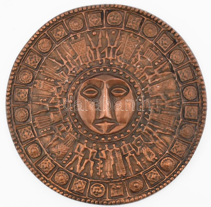 Leírás: Papp Zoltán fém fali dísz, bronzírozott alumínium, jelzés nélkül, d: 24 cm