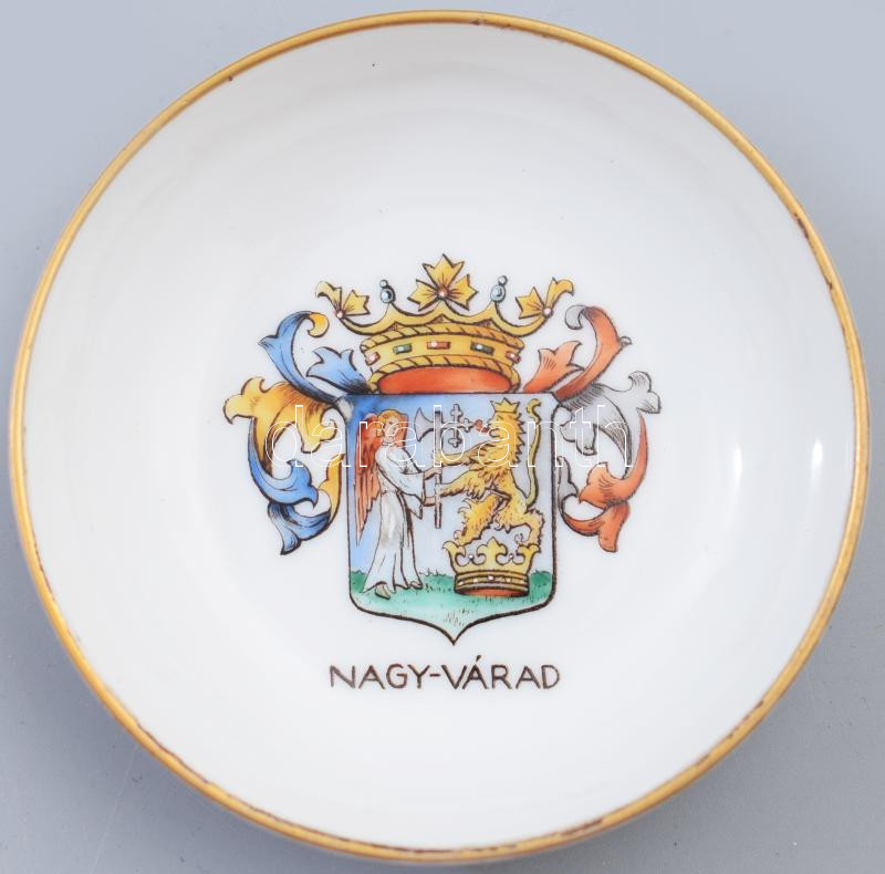 Leírás: Herendi Nagy-Várad címeres tálka, 1941, Nagyvárad visszatérésének alkalmából készített tálka, jelzett, hibátlan, d: 8 cm