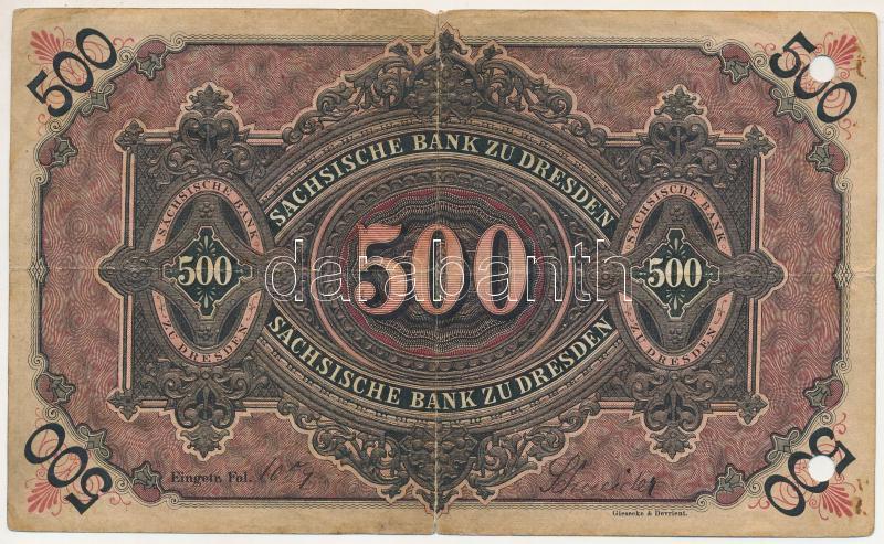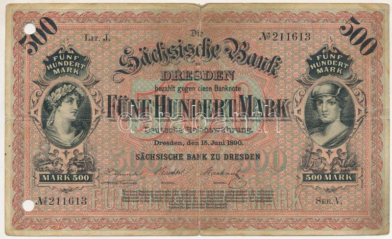 Német Birodalom / Szászország 1890. 500M T:VG nagyobb beszakadások, lyukasztások German Empire / Saxony 1890. 500 Mark C:VG larger tears, holes