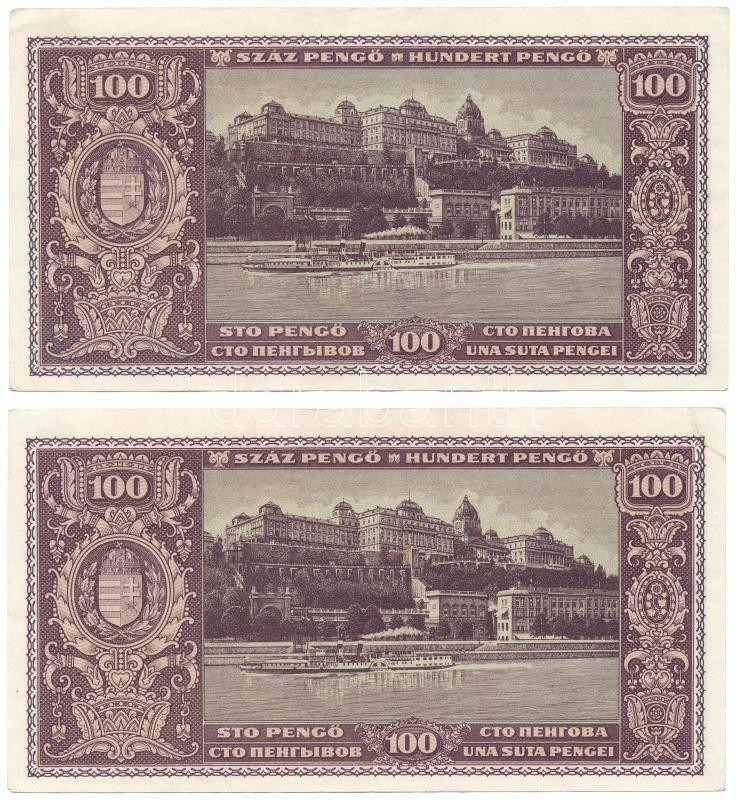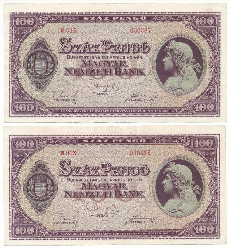 Leírás: 1945. 100P (2x) sorszámkövető pár "E 013 036387 - E 013 036388" T:F szép papír