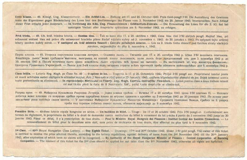 Leírás: 1942. "49. Magyar Királyi Osztálysorsjáték" első osztály 1/8 sorsjegye (C), bélyegzéssel, vízjeles papíron T:F