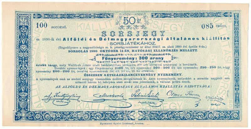 Hungary / Arad 1890. "General Exhibition of the Great Plain and Southern Hungary" lottery ticket in 50 Kreuzer value, "100 085" serial C:F fine paper