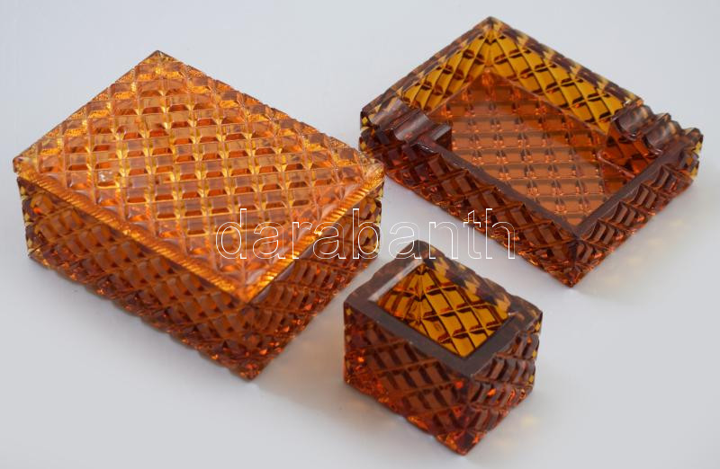 Asztali dohányzó készlet 3 részes. Borostyánszínű üveg Doboz 12x9 cm, ... https://www.darabanth.com/hu/479-Gyorsarveres/479.0/Porcelan-keramia-uveg/Uvegtargyak~500006/Asztali-dohanyzo-keszlet-3-reszes-Borostyanszinu-uveg-Doboz-12x9-cm-kinalo-hamutal~II3265006