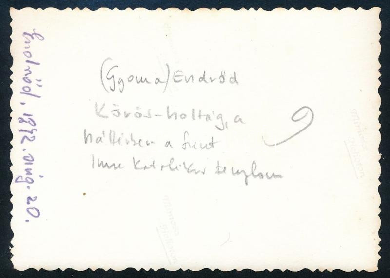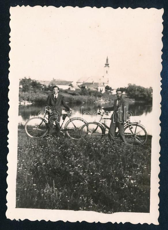 1942. aug. 20. Endrőd (Gyomaendrőd), Körös-holtág, kerékpáros férfiak, háttérben a Szent Imre katolikus templom, a hátoldalon feliratozott fotó, 8,5x6 cm