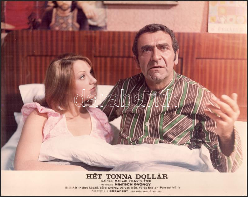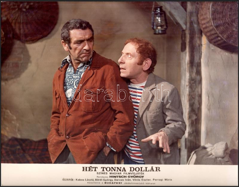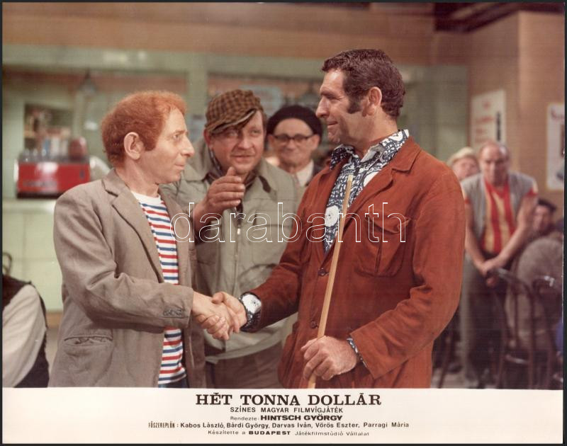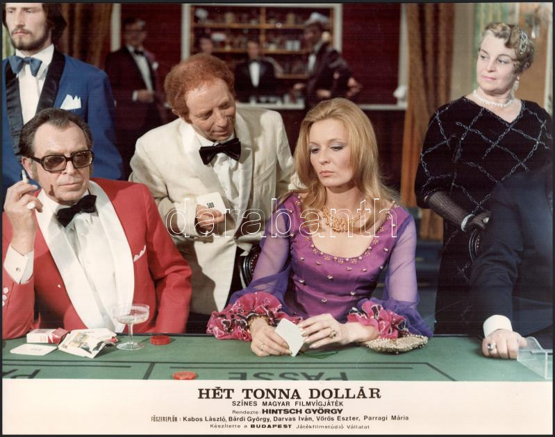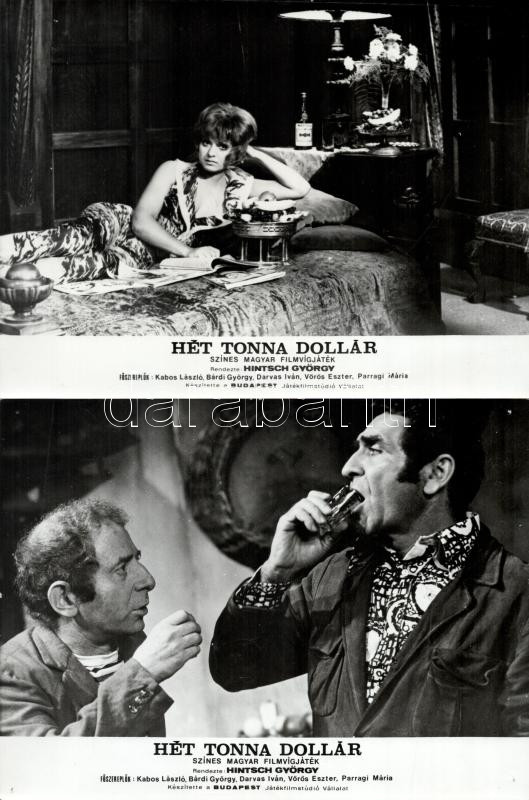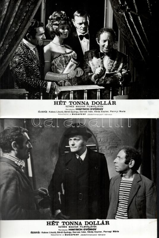 cca 1989 előtt készült, ,,Hét tonna dollár" című magyar film jelenetei és szereplői, 15 db vintage produkciós filmfotó (vitrinfotó, lobbyfotó) ezüst zselatinos fotópapíron, a használatból eredő (esetleges) kisebb hibákkal, 18x24 cm