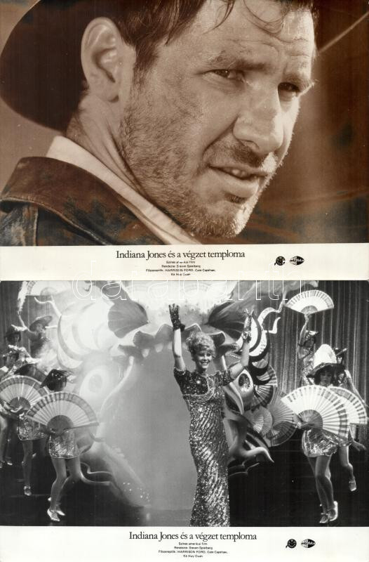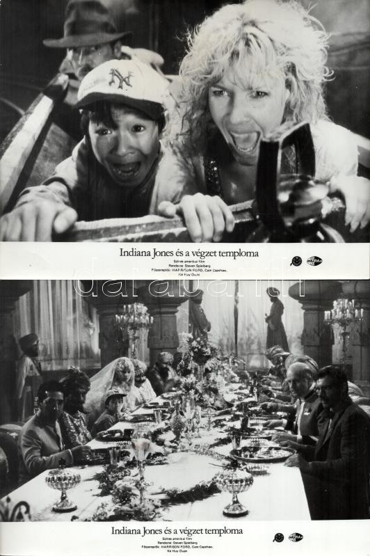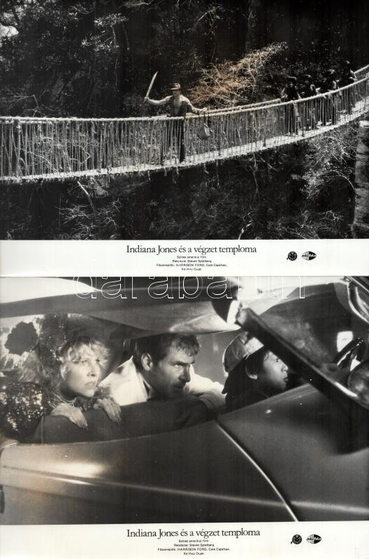 cca 1989 előtt készült, ,,Indiana Jones és a végzet temploma" című amerikai film jelenetei és szereplői, 6 db vintage produkciós filmfotó (vitrinfotó, lobbyfotó) ezüst zselatinos fotópapíron, a használatból eredő (esetleges) kisebb hibákkal, barnulással, 18x24 cm