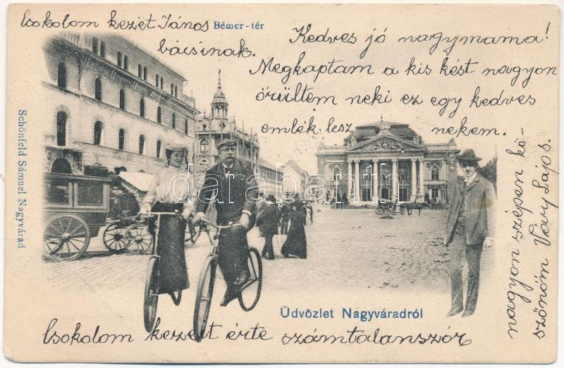 Leírás: 1905 Nagyvárad, Oradea; Bémer tér, színház. Montázs kerékpáros párral, biciklizők, Schönfeld Sámuel kiadása / square, theatre. Montage with couple on bicycle (EB)