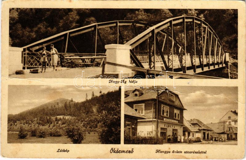 1944 Ökörmező, Volove Polje, Volové, Mizhhirya; Nagy-Ág hídja, látkép, utca részlet, vendéglő, Hangya szövetkezet üzlete és saját kiadása / bridge, general view, street view with restaurant and cooperative shop (fa)