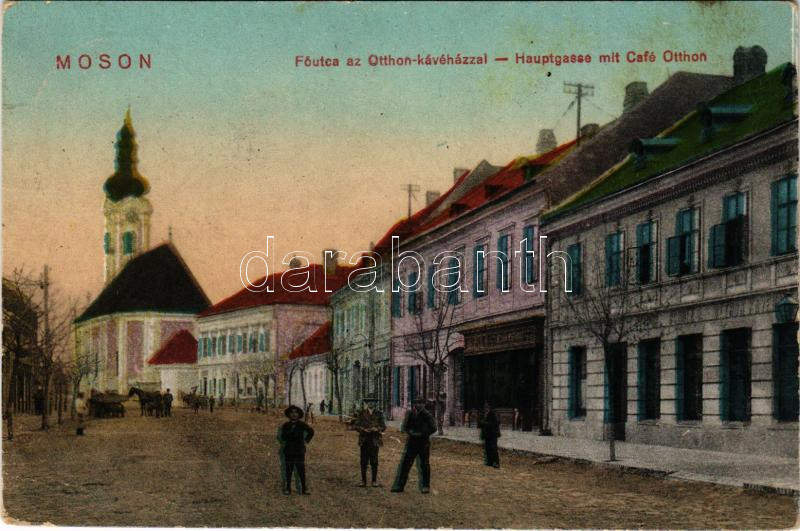 Leírás: 1931 Moson, Mosonmagyaróvár; Fő utca, Otthon kávéház. Freitag Frigyes kiadása (EK)