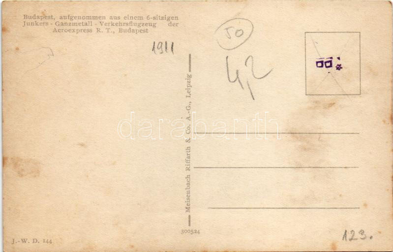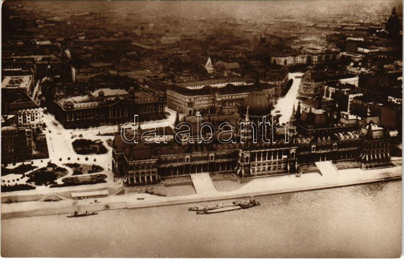 Budapest V. Országház, Parlament. Légi felvétel egy hatüléses Junkers-Ganzmetall utasszállító repülőgépből / aufgenommen aus einem 6-sitzigen Junkers-Ganzmetall-Verkehrsflugzeug der Aeroexpress R.T. J.-W.D. 144. / aerial view taken from a Junkers all-metal six-seater commercial airplane of the Aero Express R.T. (fl)