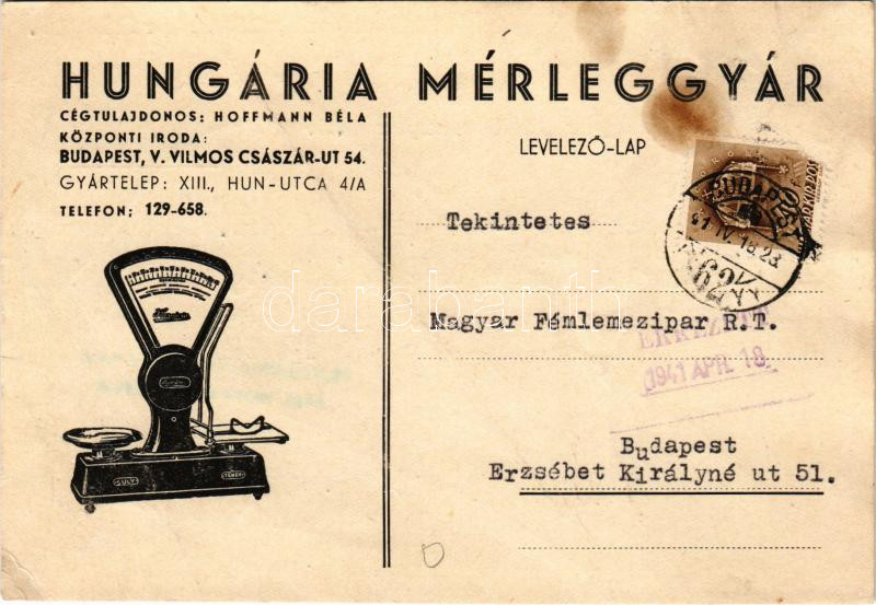 1941 Hungária mérleggyár reklámja. Központi iroda - Budapest V. Vilmos császár út 54. Gyártelep - XIII. Hun utca 4/A / Hungarian scale factory advertisement postcard (b)