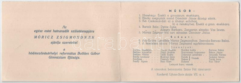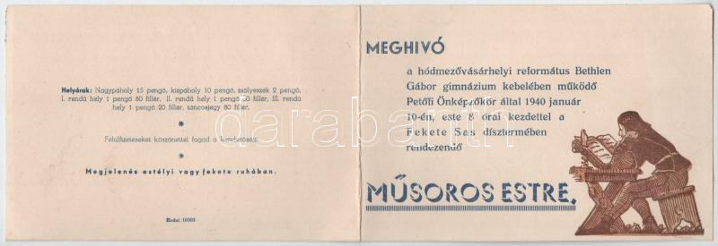 Meghívó a hódmezővásárhelyi református Bethlen Gábor gimnázium kebelében működő Petőfi Önképzőkör által 1940 január 10-én, este 8 órai kezdettel a Fekete Sas dísztermében rendezendő Műsoros Estre - kinyitható nyomtatvány (non PC)