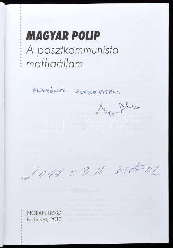 Magyar Bálint (szerk.): Magyar polip. A posztkommunista maffiaállam. A szerkesztő, Magyar Bálint (1952-) szociológus, történész, politikus, volt oktatási miniszter, az SZDSZ alapító tagja, 1998-tól 2000-ig elnöke által DEDIKÁLT példány! Bp.,2013, Noran Libro. Kiadói papírkötés, jó állapotban.