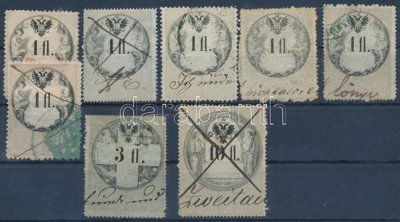 Leírás: 1858-63 illetékbélyeg összeállítás fogazat változatokkal, csak nagyobb címletek