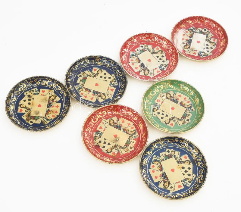 Leírás: 7 db kártya mintás fém tálka, kopásnyomokkal, d: 10 cm