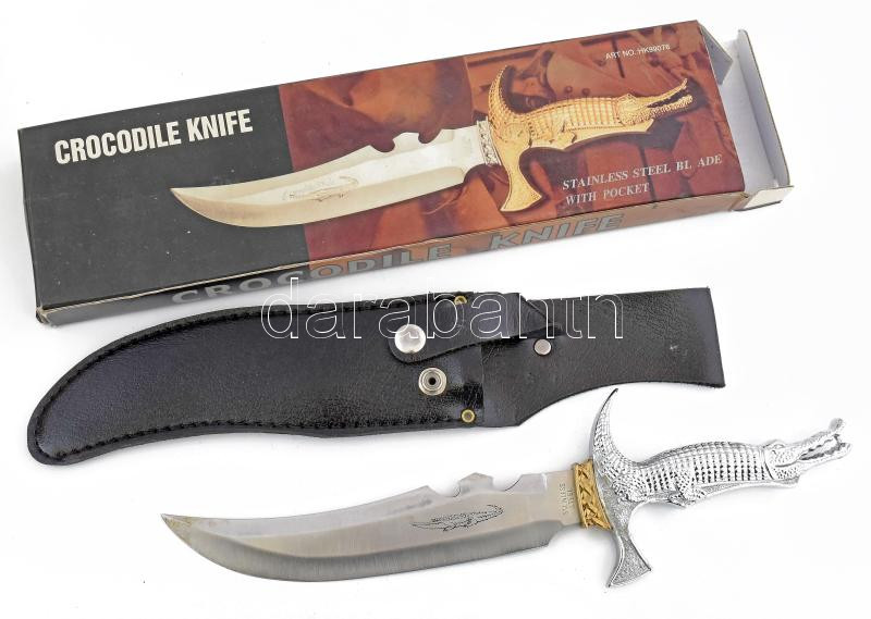 Leírás: Krokodil alakú nyéllel díszített kés, tokban, h: 31 cm