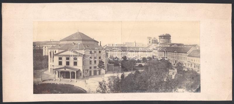 cca 1868 Pest, Erzsébet (Újvásár) tér Német színház (1870-ben lebontották), háttérben az épülő Bazilika, jobb oldalt a lebontott Török udvar. Calderoni fotó. kartonon. Teljes méret 33x14 cm, fotó 24x10,5 cm Nagyon ritka fotó!