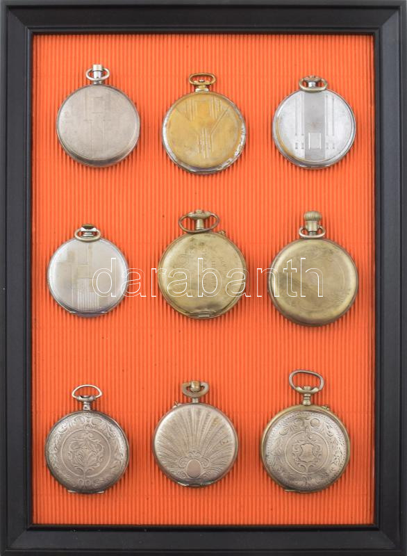 Leírás: 9 darab antik zsebóra tok, támasztható keretbe ragasztva, 33x24 cm