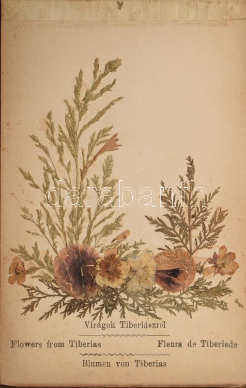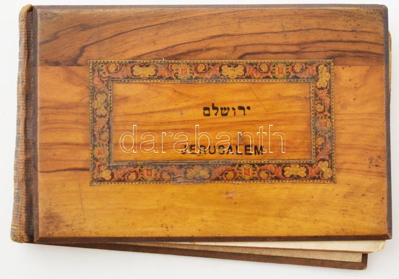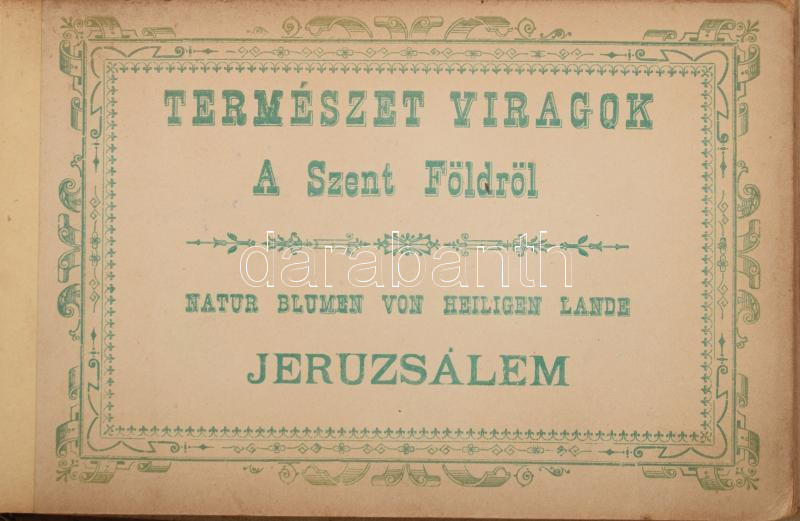 cca 1900-1910 Jeruzsálem, természet virágok a Szentföldről, emlékalbum szárított, préselt virágokkal, magyar, angol, francia és német nyelven feliratozva. Harántalakú fatáblás kötésben, korának megfelelő állapotban, az előzéklapon ajándékozási sorokkal, 12 sztl. lev.