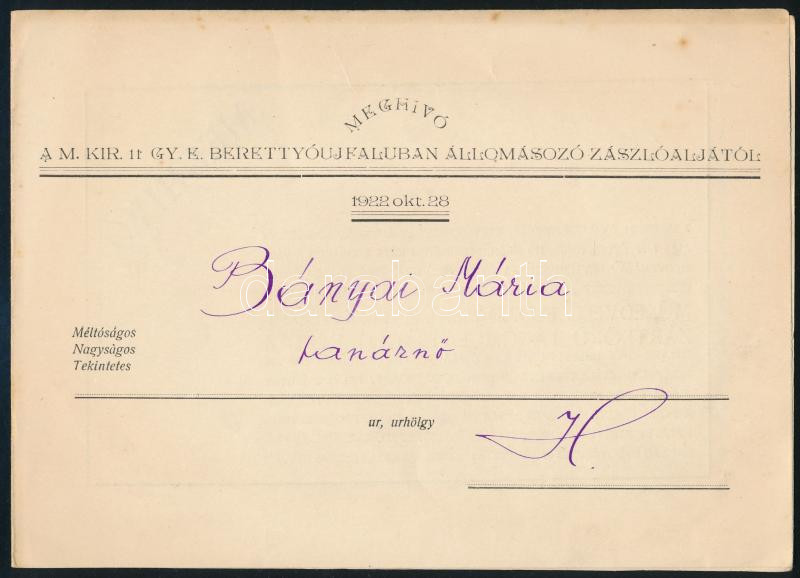 Leírás: 1922 Meghívó a M. Kir. Gy. E. Berettyóújfaluban Állomásozó Zászlóaljától táncmulatságra