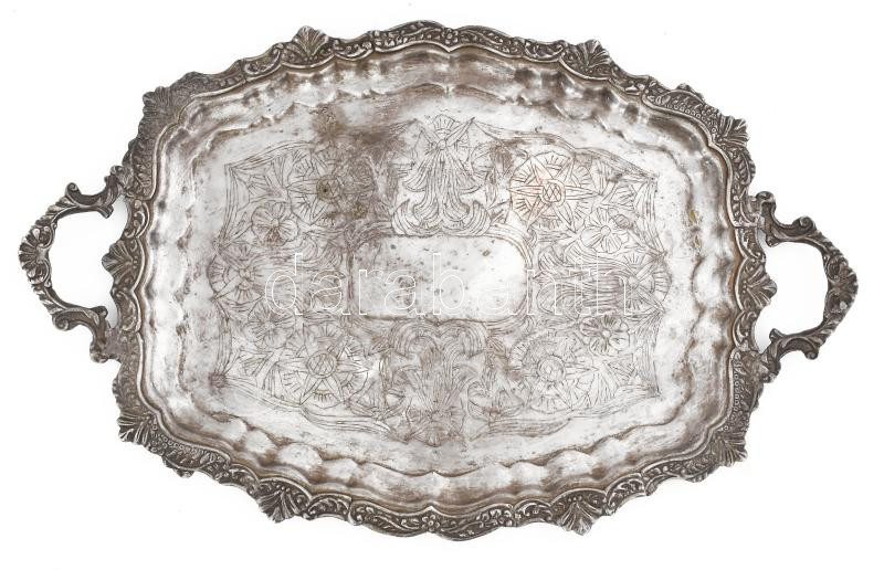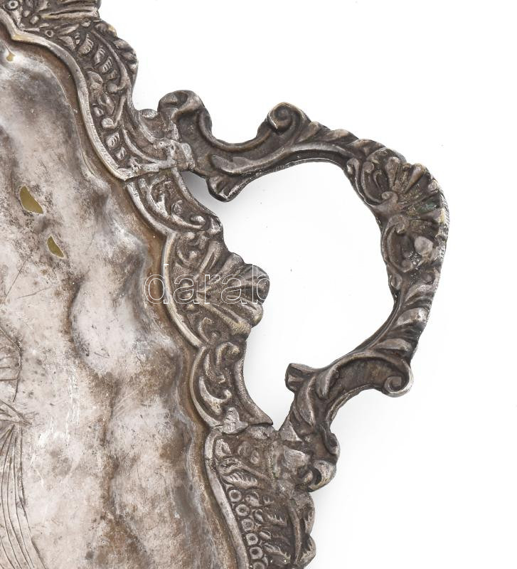 Leírás: Antik ezüstözött alpakka tálca, kopással, 51x32 cm