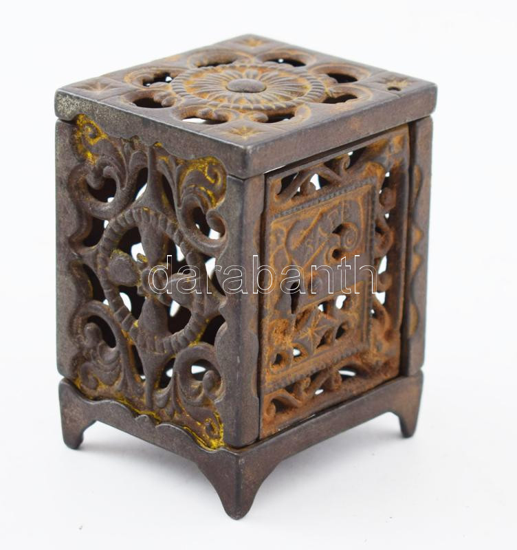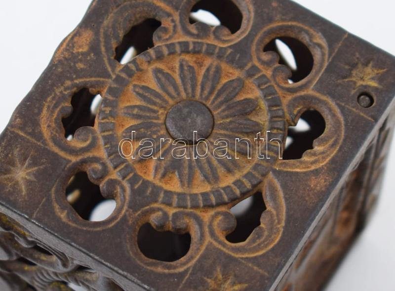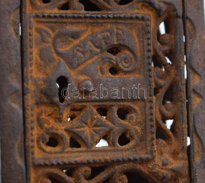 Leírás: Mini széf, persely, coin bank. Öntöttvas, áttört, kulcs nélkül 19 cm
