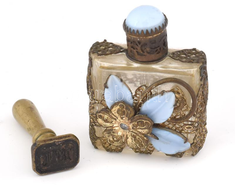 Leírás: Régi parfümös üvegcse, fém rátéttel 5 cm, + réz pecsétnyomó