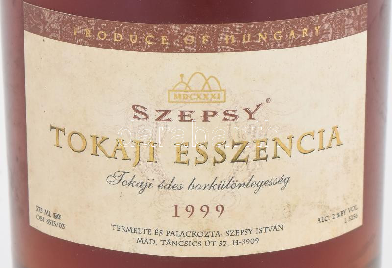 1999 Szepsy Tokaji Esszencia, bontatlan palack édes fehér desszertbor,... https://www.darabanth.com/hu/480-Gyorsarveres/480.0/Mutargy-papirregiseg-egyeb/Muzealis-borok-italok~500017/1999-Szepsy-Tokaji-Esszencia-bontatlan-palack-edes-feher-desszertbor-2-0-375l~II3268531