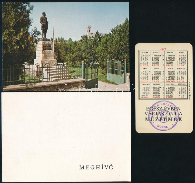 Leírás: cca 1971-1977 Monoki Kossuth Emlékmúzeum meghívója + 1977 kártyanaptára, és a monoki Kossuth szobort ábrázoló képeslap.