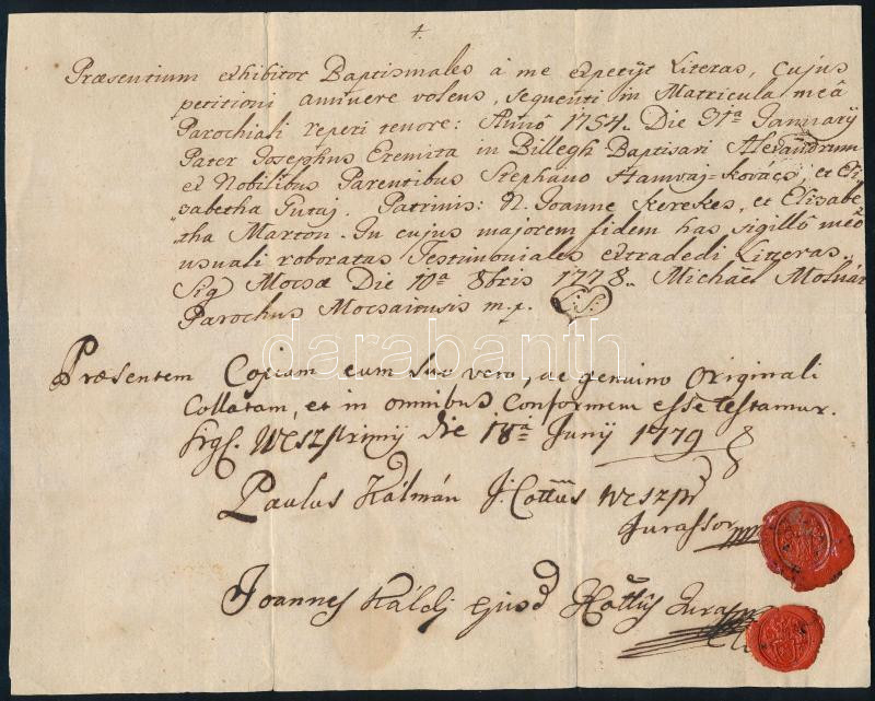 Leírás: 1779 Veszprém, Mocsán kiállított keresztlevél hiteles másolata, latin nyelven, "Paulus Kálmán" és "Joannes Káldi" aláírásokkal, viaszpecsétekkel