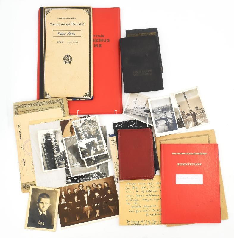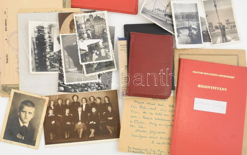 Leírás: Közgazdász és feleségének igazolványai (MDP, MSZMP), bizonyítványok, fotók, stb.