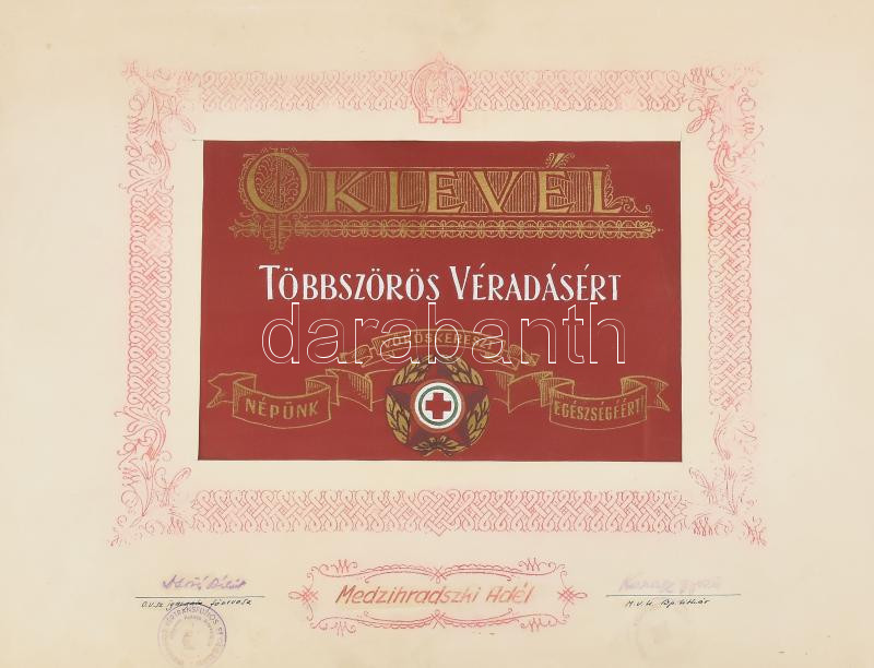 cca 1950 Magyar Vöröskereszt oklevél többszörös véradásért Medzihradszki Adél részére, középső része festett selyem, Rákosi-címerrel, bélyegzett aláírásokkal, kissé viseltes állapotban, 49x37,5 cm