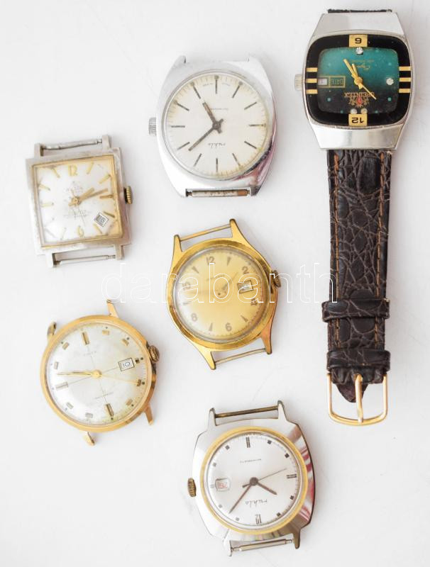 Leírás: 6 darab vegyes karóra szíj nélkül, közte Ruhla, Wilson, Junghans, Oreintex, szervizelendő