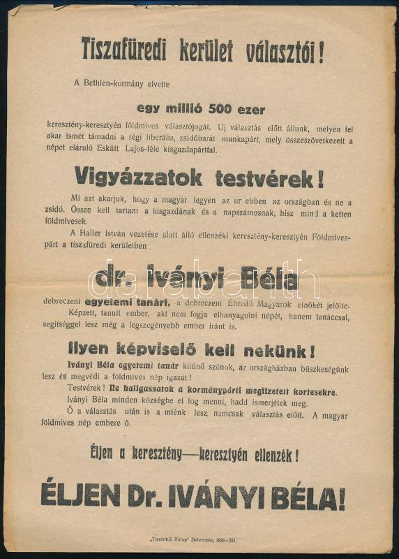 1922 Tiszafüred, antiszemita választási plakát, közepén hajtásnyommal,... https://www.darabanth.com/hu/480-Gyorsarveres/480.0/Mutargy-papirregiseg-egyeb/Plakat~1500019/1922-Tiszafured-antiszemita-valasztasi-plakat-kozepen-hajtasnyommal-29x21-cm~II3277238