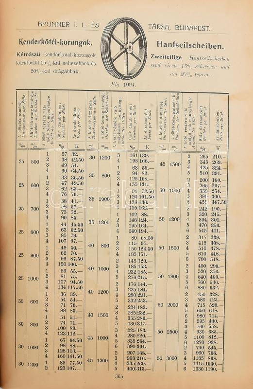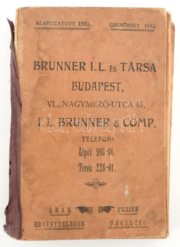 Leírás: 1913 Bp. VI. Nagymező utca, Brunner I. L. és Társa Budapest árjegyzék, széteső állapotban, 880p
