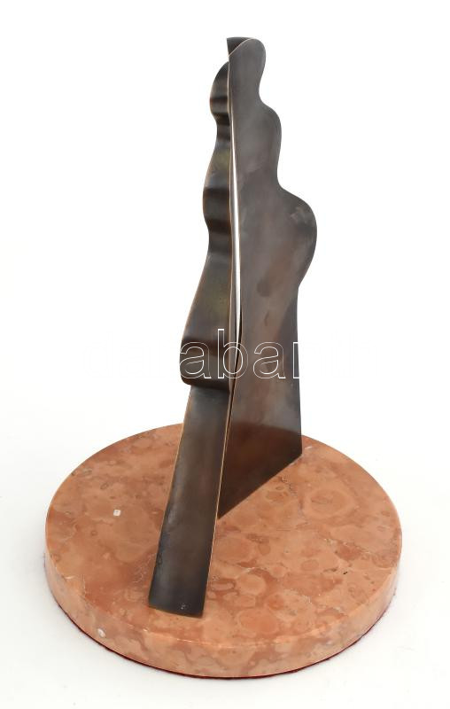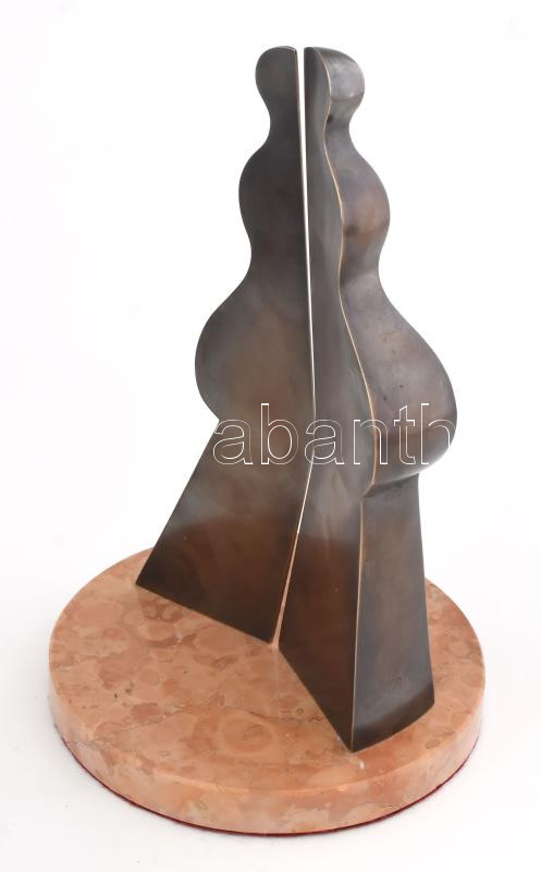 Deim Pál (1932-2016): Bábu. Patinázott bronz, márvány talapzaton. Jelzett DP. d: 17,5 cm, m: 26,5 cm Deim Pál művészetében, a stilizált bábu az egyik legjellegzetesebb motívuma, amely mint egy embernek a emlékműve, mely térsíkok közé van szorítva, jelenik meg, mind a festészetében úgy a kisplasztikáin is. Foglalkoztatta a magányosság és az emberben lévő kettősség és a világban helyét kereső ember kérdése is. Barcsay Jenő és Vajda Lajos művészete egyszerre inspirálta.