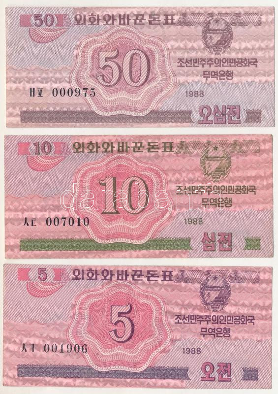 Leírás: Észak-Korea 1988. 5ch "001906" + 10ch "007010" + 50ch "00975" (Szocialista látogató devizaváltó) T:F, szép papír